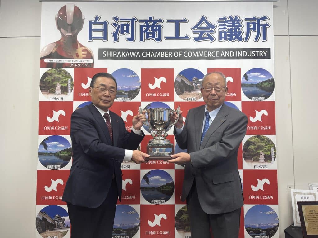 2025年10月4日(土)に開催された「会員交流ゴルフ大会」の優勝者表彰を、白河商工会議所会議室にて行いました。 当日は、鈴木俊雄会頭より、優勝者の白河信用金庫 鈴木一永様へ景品およびトロフィーが授与されました。