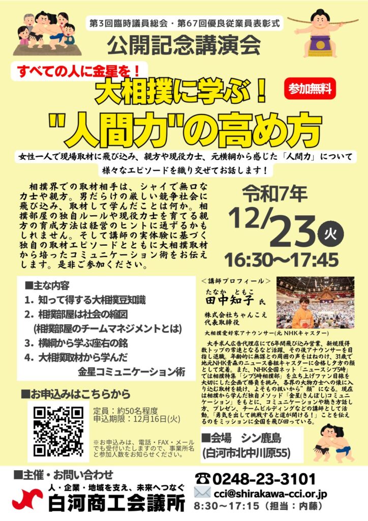 講師自身が大相撲取材から学んだコミュニケーション術を実体験を交えながらお伝えする特別講演です。相撲界での取材相手は、シャイで無口な力士や親方ばかり。男性社会の厳しい競争の中に飛び込み、取材を通して見えてきた“人間力”とは […]