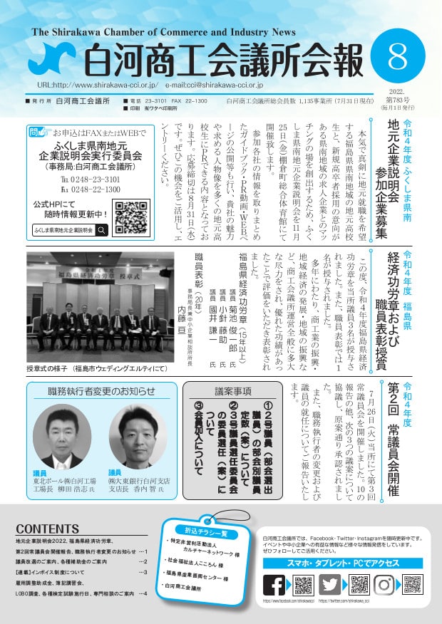 白河商工会議所会報8月号が発行されましたので、ご確認ください。