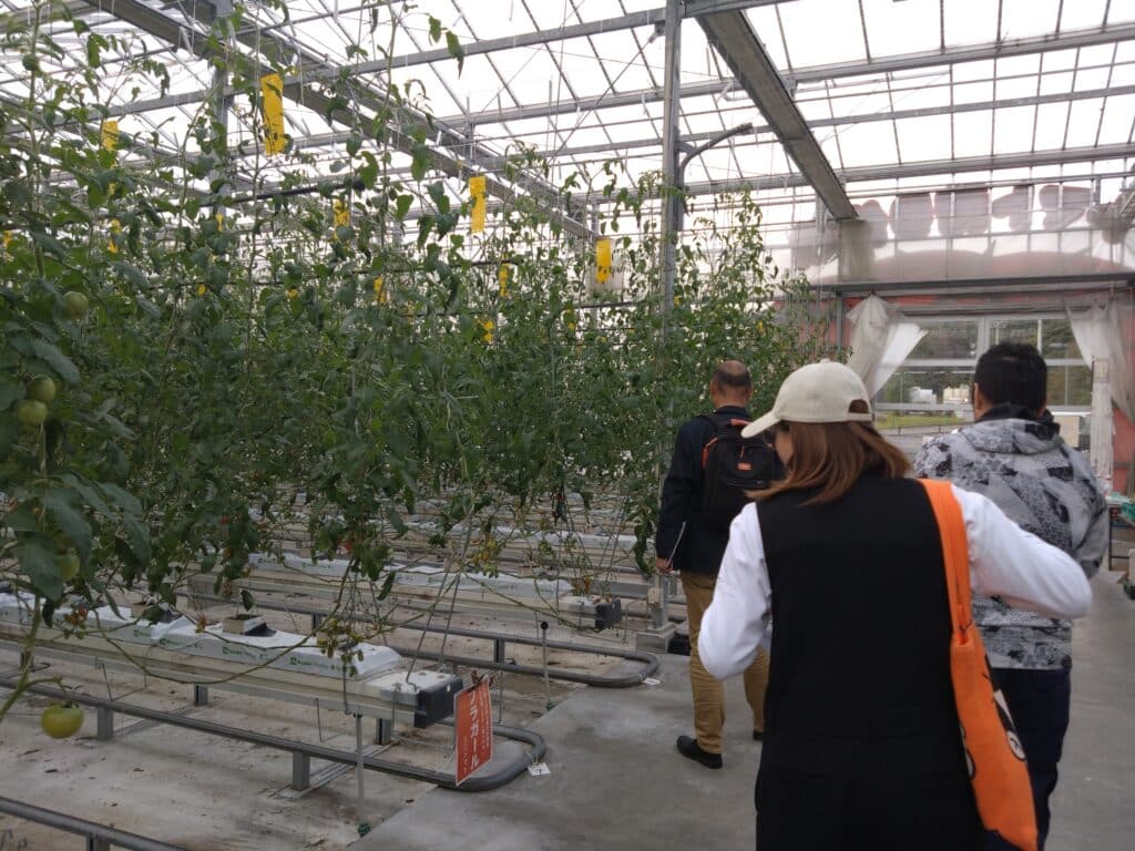 また、ワンダーファームでは、大型のハウスの中で行われているトマトの栽培について、施設の特長や品種、出荷先などの説明を受けました。参加者は、実際にトマトを試食したり、トマトを使った加工品を購入するなど、六次化商品の生産・販売の現場を体験しました。